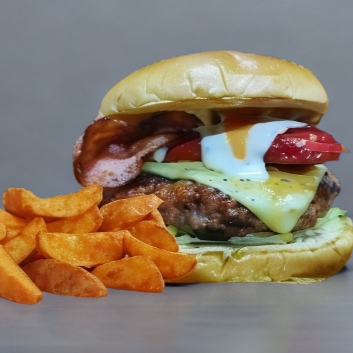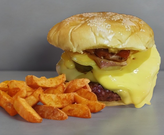 Pan brioche, 150gr carne jugosa de res, gratinada con 4 quesos: gouda, cheddar, americano y manchego. Tocino ahumado, chile jalapeño, aderezo ranch. Incluye porción individual de papas gajo.