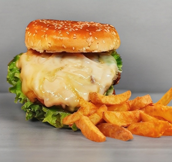 Pan brioche, 150gr carne jugosa de res, queso americano, lechuga italiana, cebolla dulce cremosa. Incluye porción de papas gajo.