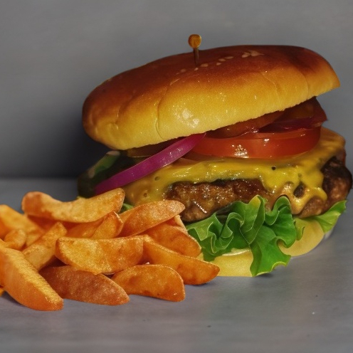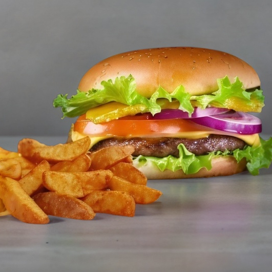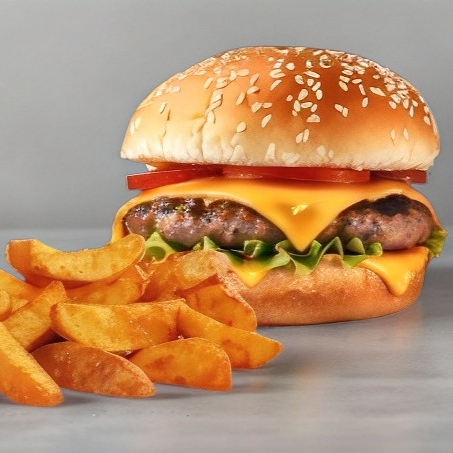 Pan brioche, 150gr carne jugosa de res, queso americano, lechuga italiana, tomate, cebolla morada. Incluye porción individual de papas gajo.