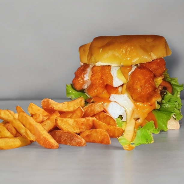 150gr Carne jugosa de res, pan brioche, queso americano, lechuga italiana, boneless bañados en salsa búfalo, aderezo ranch. Incluye porción individual de papas gajo.