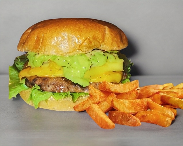 Pan brioche, 150gr carne jugosa de res, queso americano, gajos de aguacate, tocino, chorizo ahumado y aderezo ranchipotle. Incluye porción individual de papas gajo.