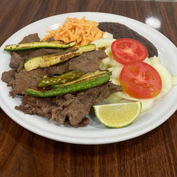 Pieza de arrachera a la plancha incluye guarniciones a elegir.