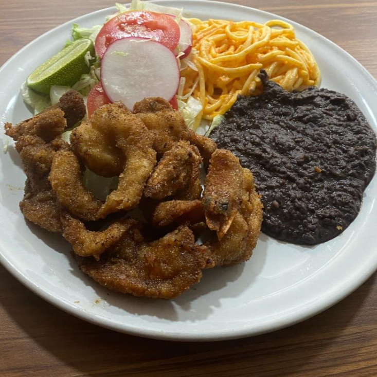 Porción de camarones empanizados incluye guarniciones a elegir.