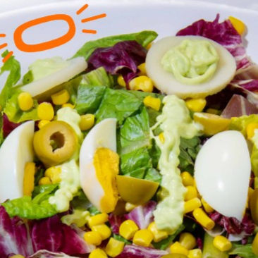 Mix de lechugas,palmitos, huevo, aceitunas y aderezo de yogur con aguacate.