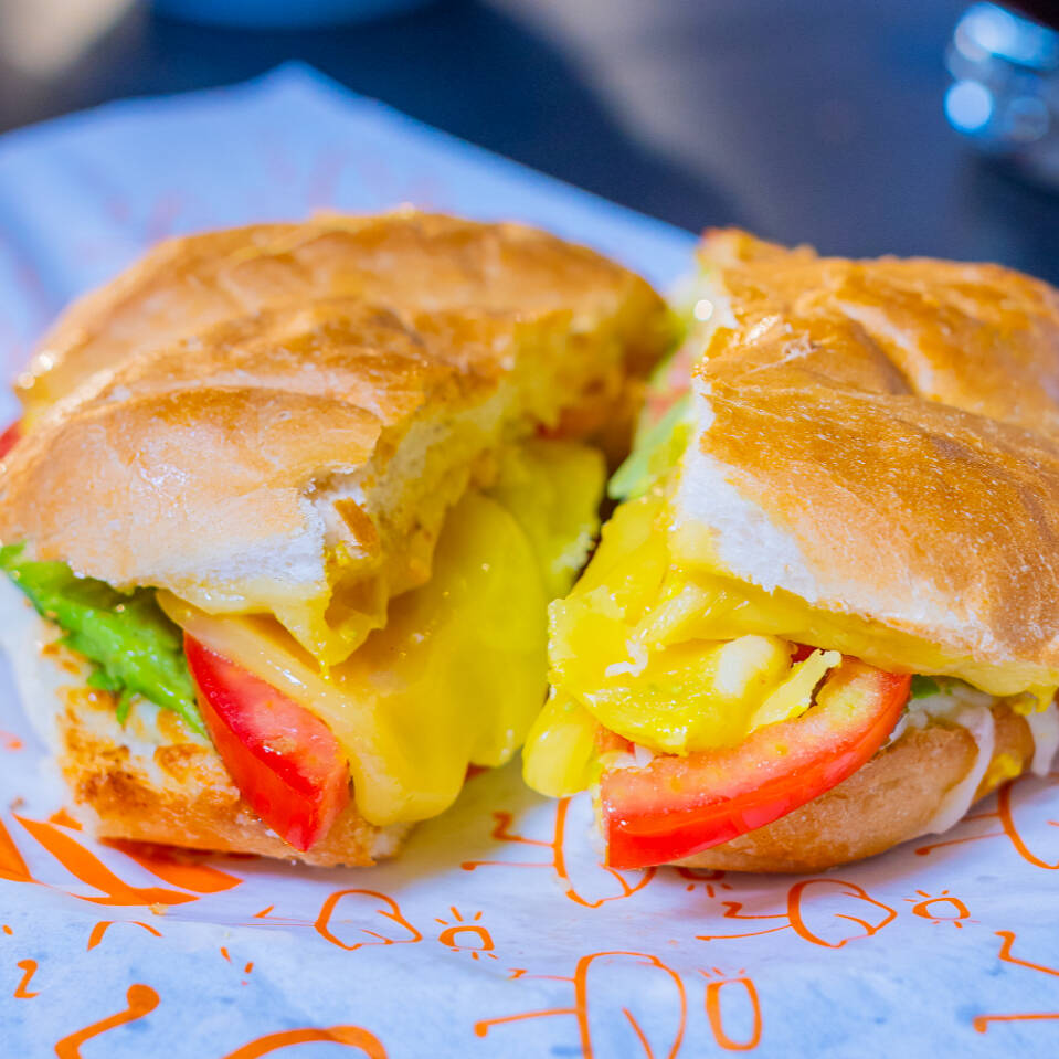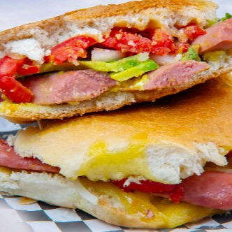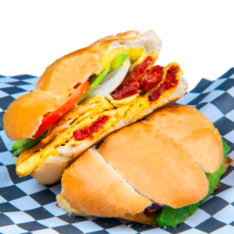 Chorizo español maduro acompañado con torta de huevo y gratinado sobre el pan.