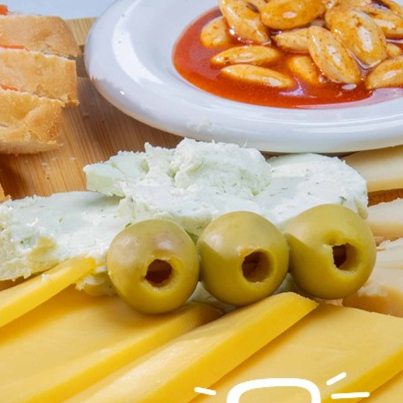 Quesos manchego español, queso holandés, queso de cabra natural, brocheta de aceitunas y almendras caramelizadas con paprika.