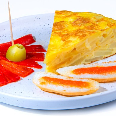 Porción individual de tortila española de papa con huevo, decorado con pimiento piquillo y aceituna.