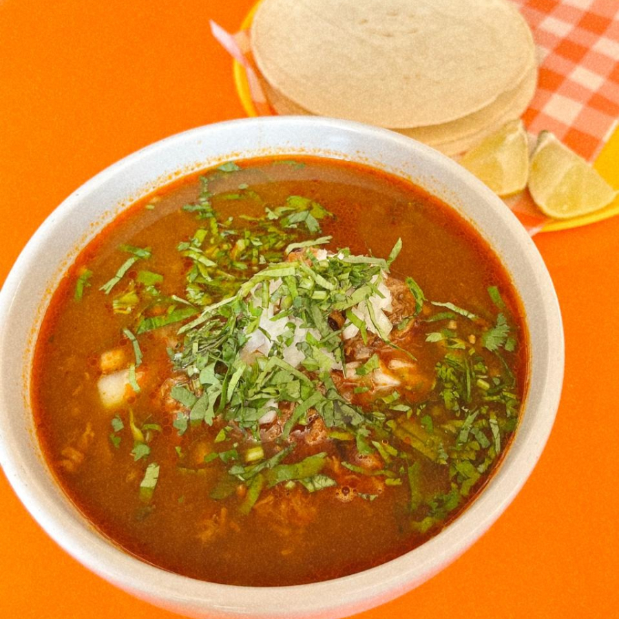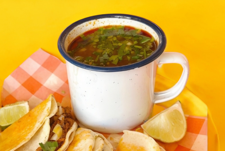 Consome de birria de res con carne de birria de res, acompañado de orden de tortillas