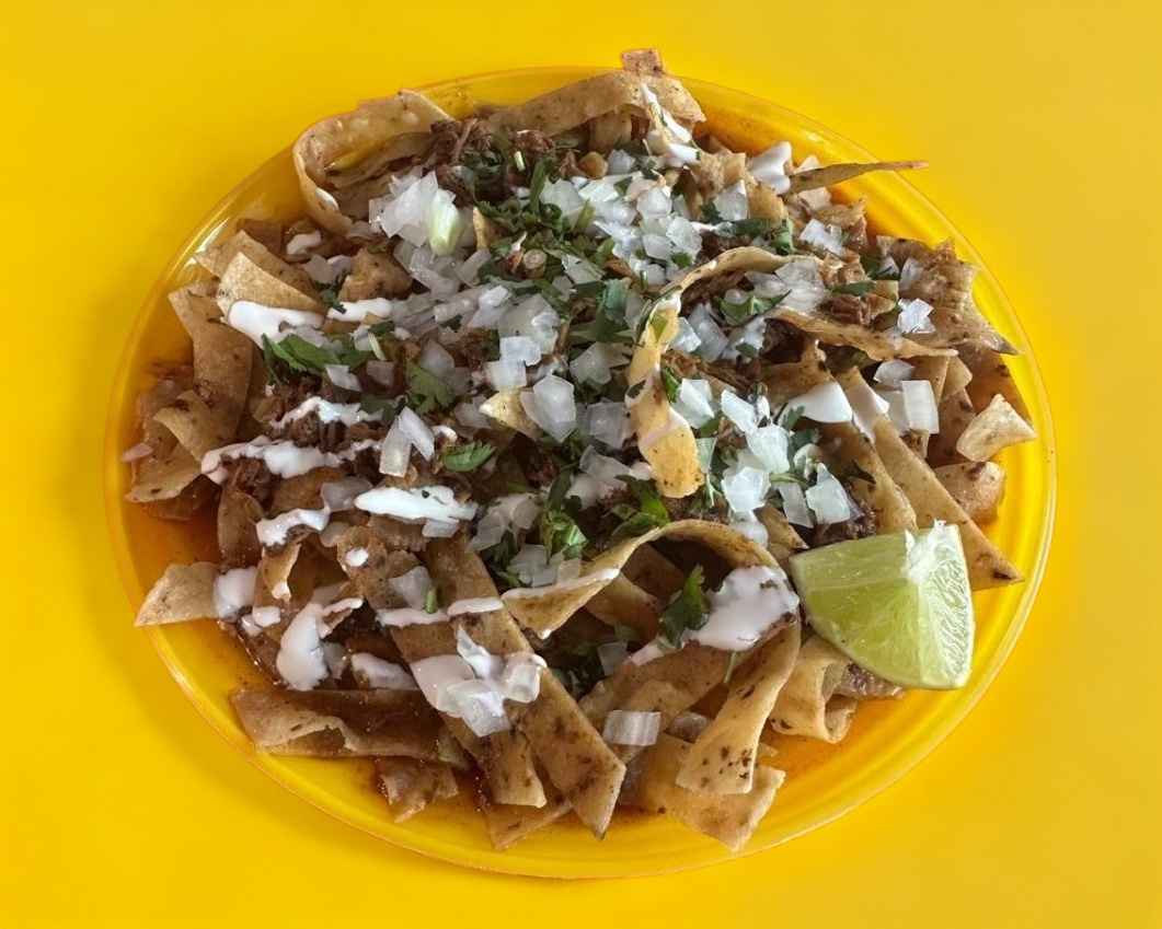 Tortilla frita con birria de res, hidratado con consome de birria y media crema