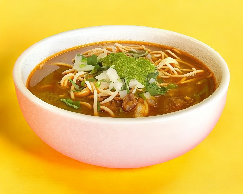 Delicioso consome de birria con carne de birria de res y ramen