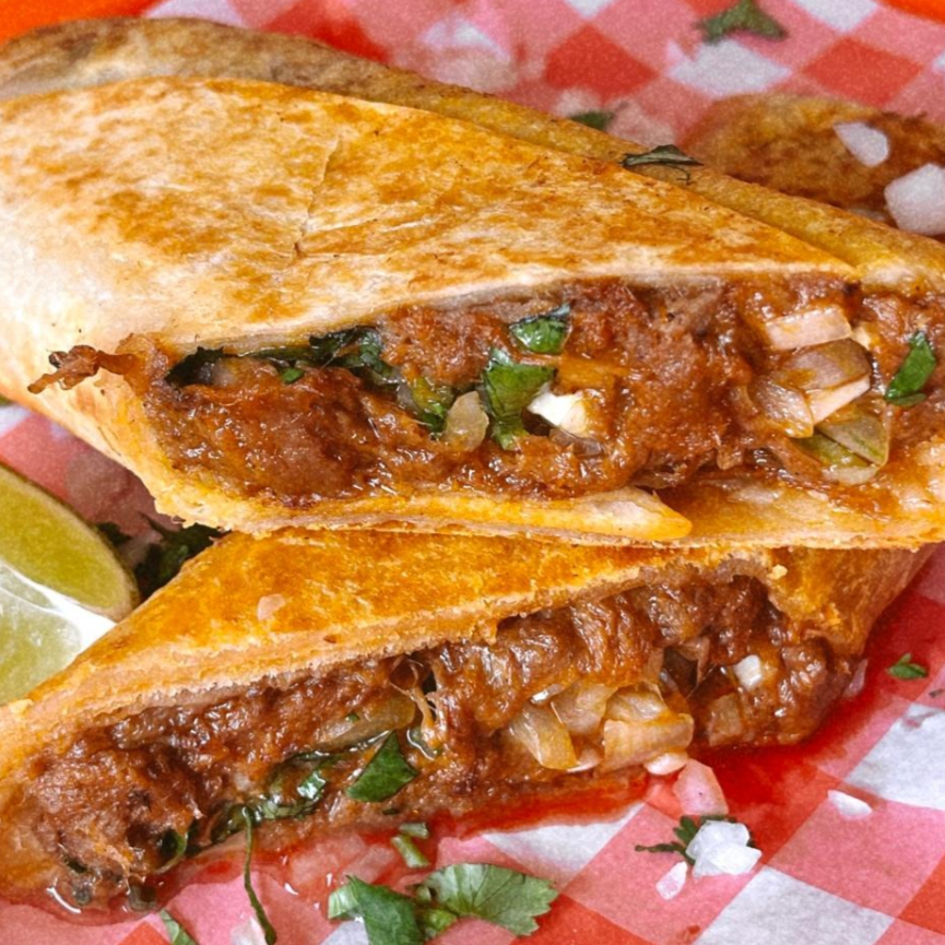 Quesadilla de harina con birria de res y queso chihuahua