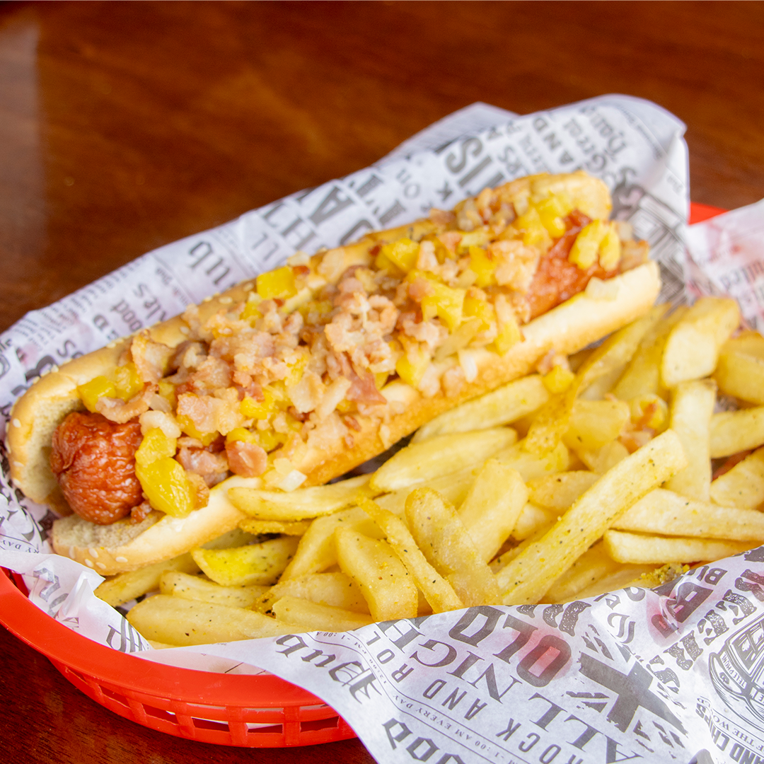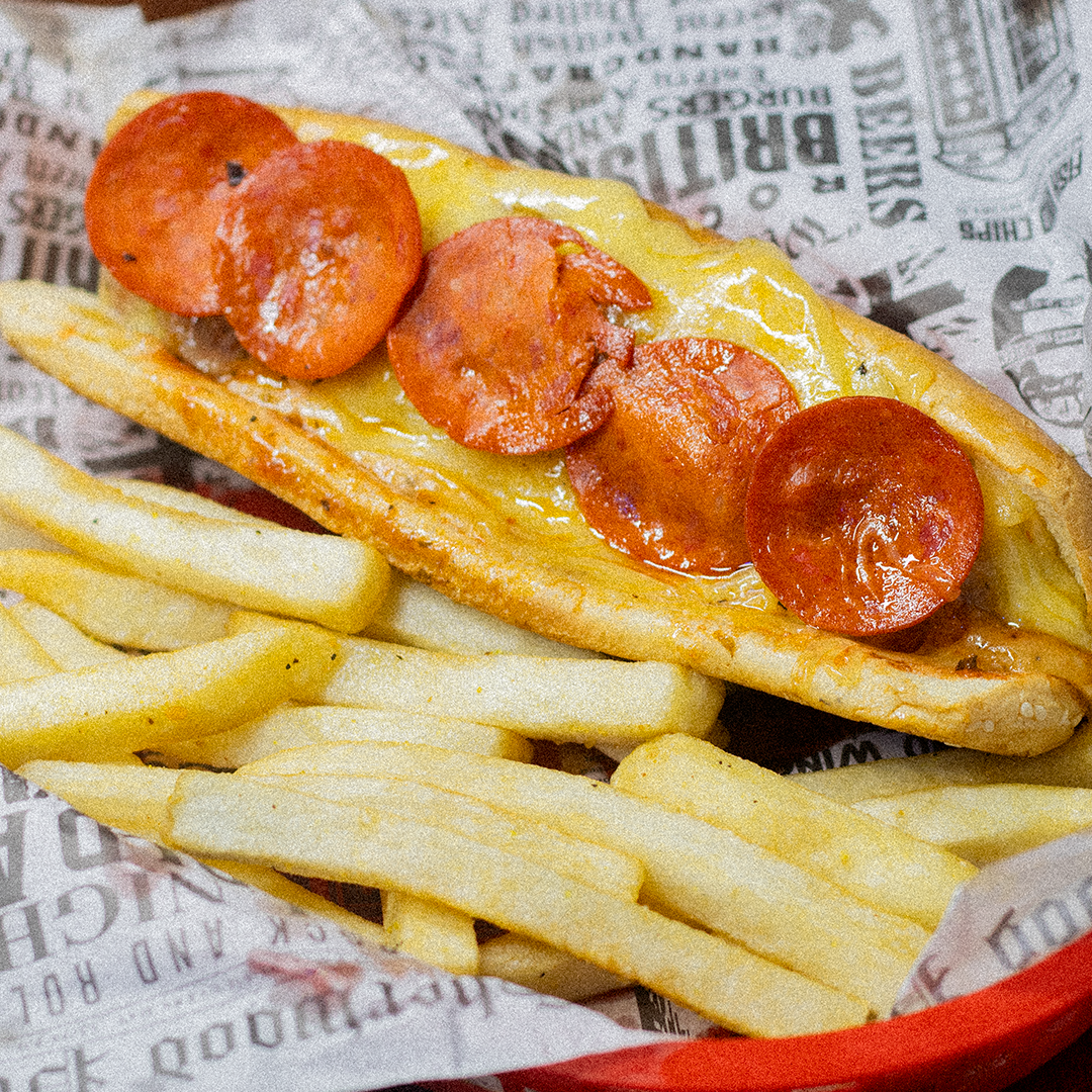 salchicha jumbo, queso manchego fundido, mostaza clásica, pepperoni crujiente y trozos de tocino dorado. Acompañado de papas a la francesa.