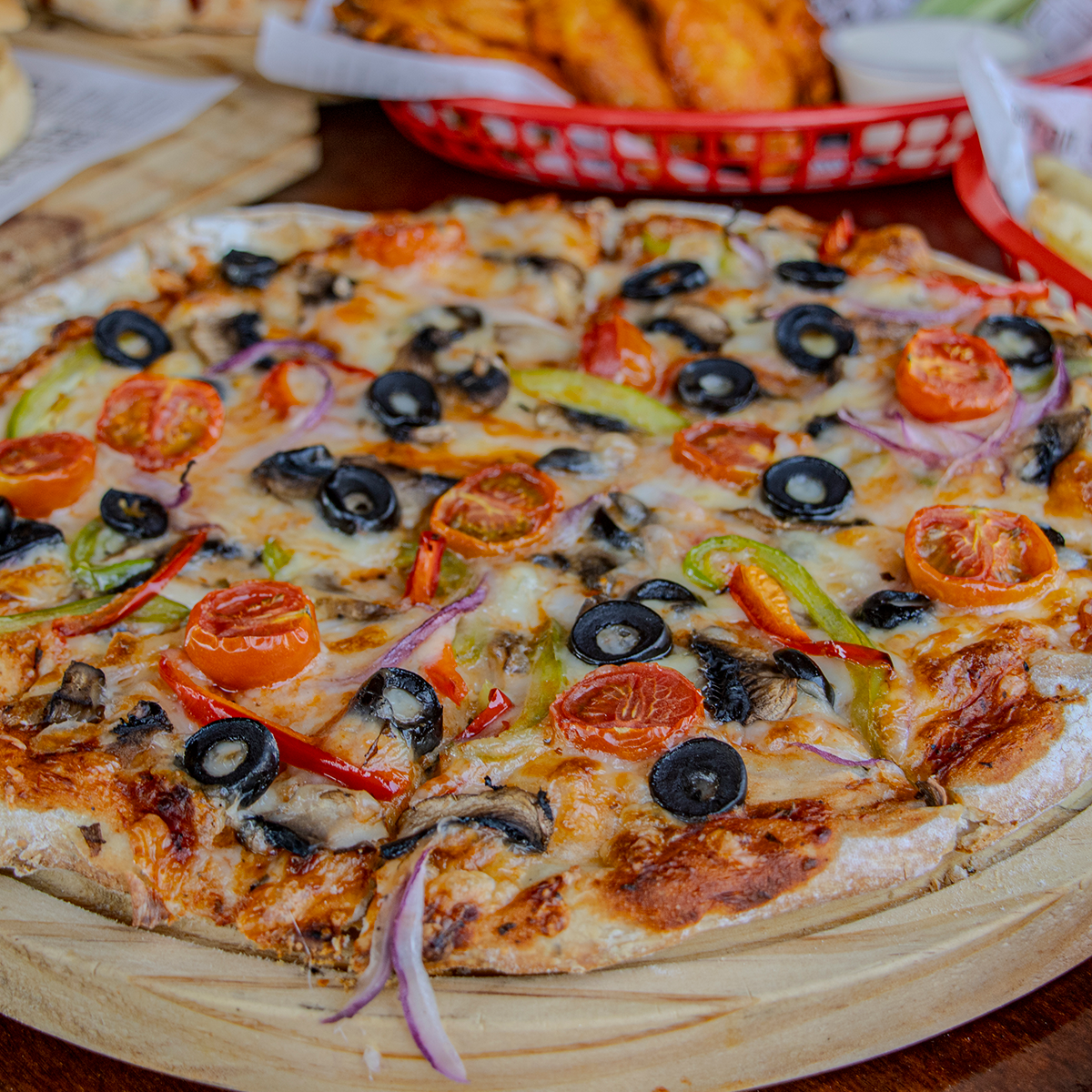 Salsa pomodoro, queso mozarella, champiñones, tomates cherry, cebolla morada, aceitunas negras, pimientos y albahaca.