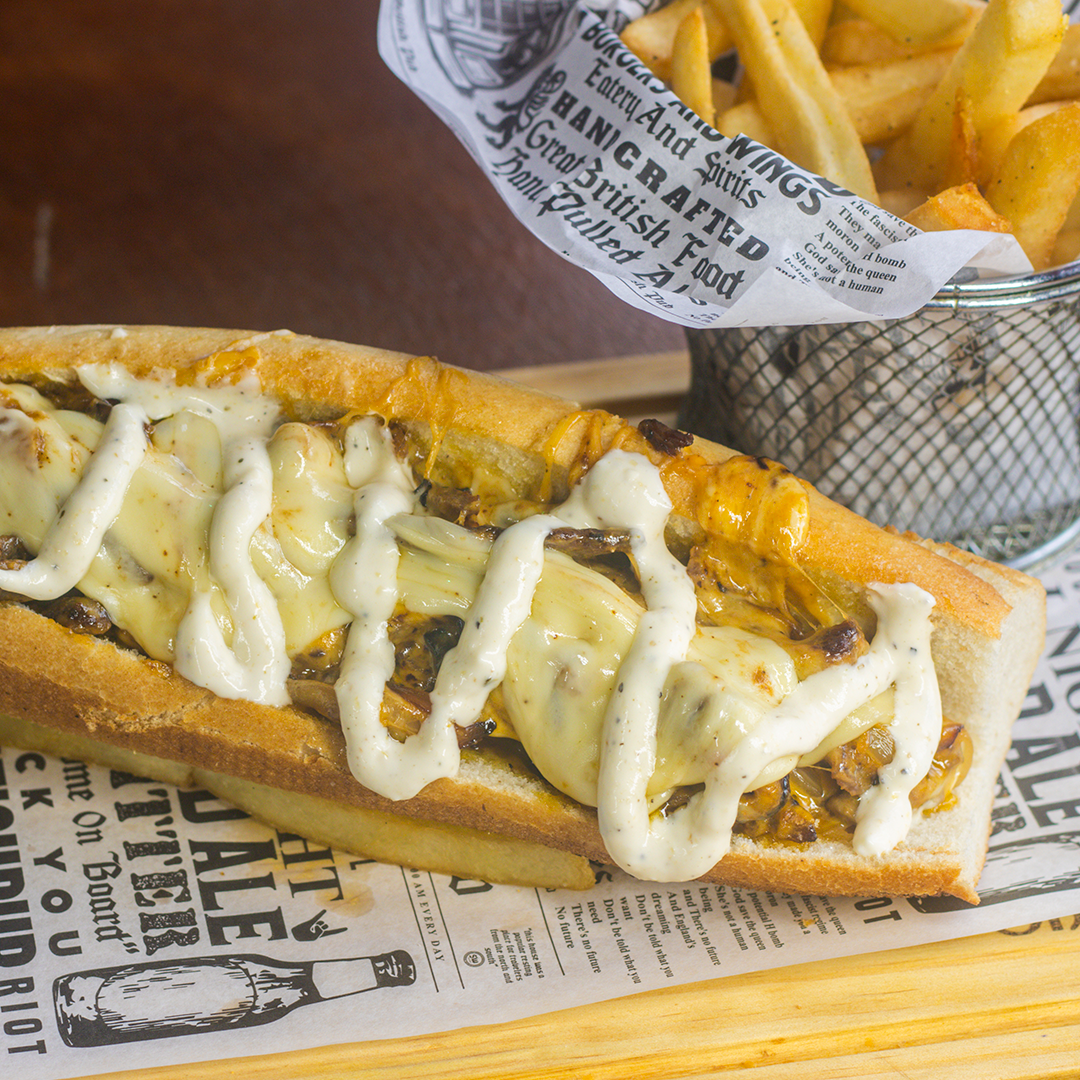 Tiras de bistec de res sazonadas con sal y pimienta negra, salteadas con cebolla blanca y gratinadas con queso manchego. Servido en pan baguette crujiente con aderezo ranch y un toque de salsa BBQ ahumada hot. Acompañado de papas a la francesa.