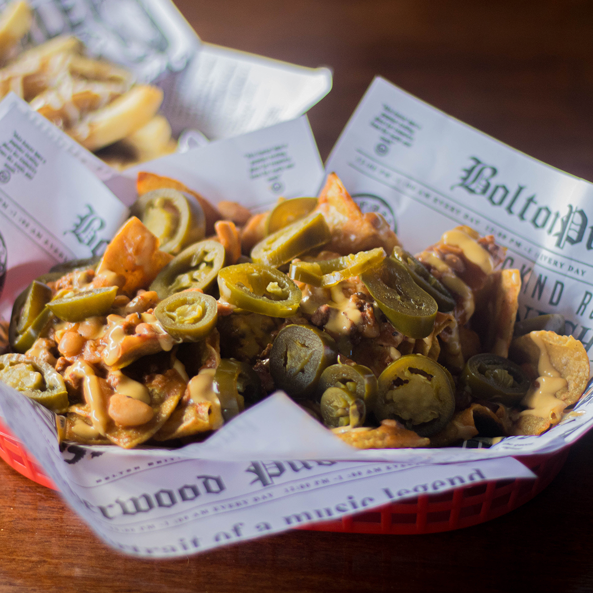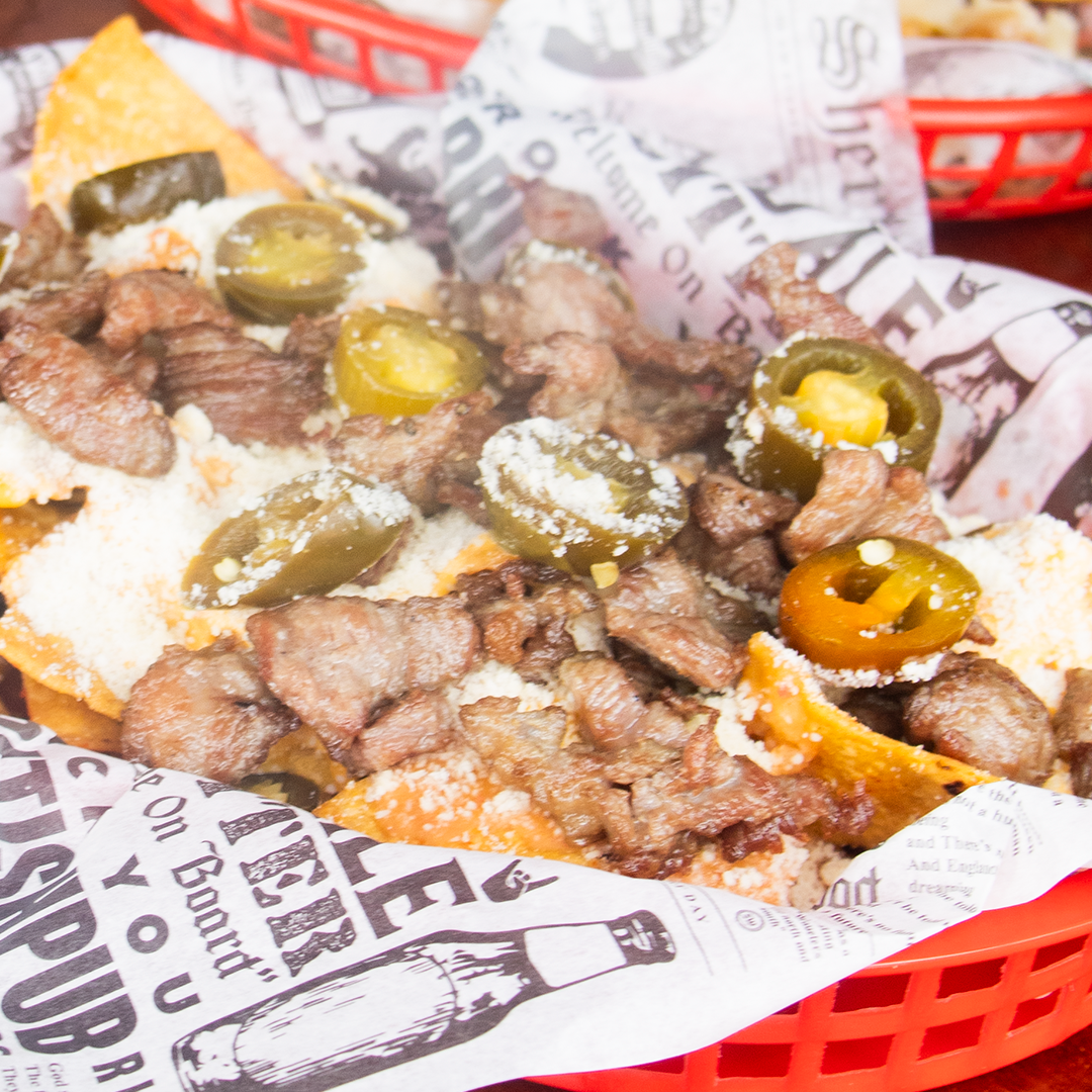 Totopos de maíz , cubiertas con nuestro adobo especial, queso cheddar, jalapeños y nuestro chillibeans de casa.