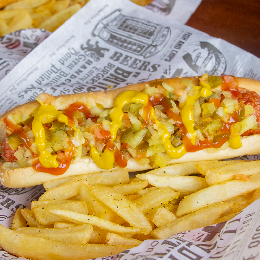 dog con salchicha jumbo, tomate fresco, cebolla blanca, pepinillos y jalapeños. Terminado con mostaza clásica y catsup, acompañado de papas a la francesa..