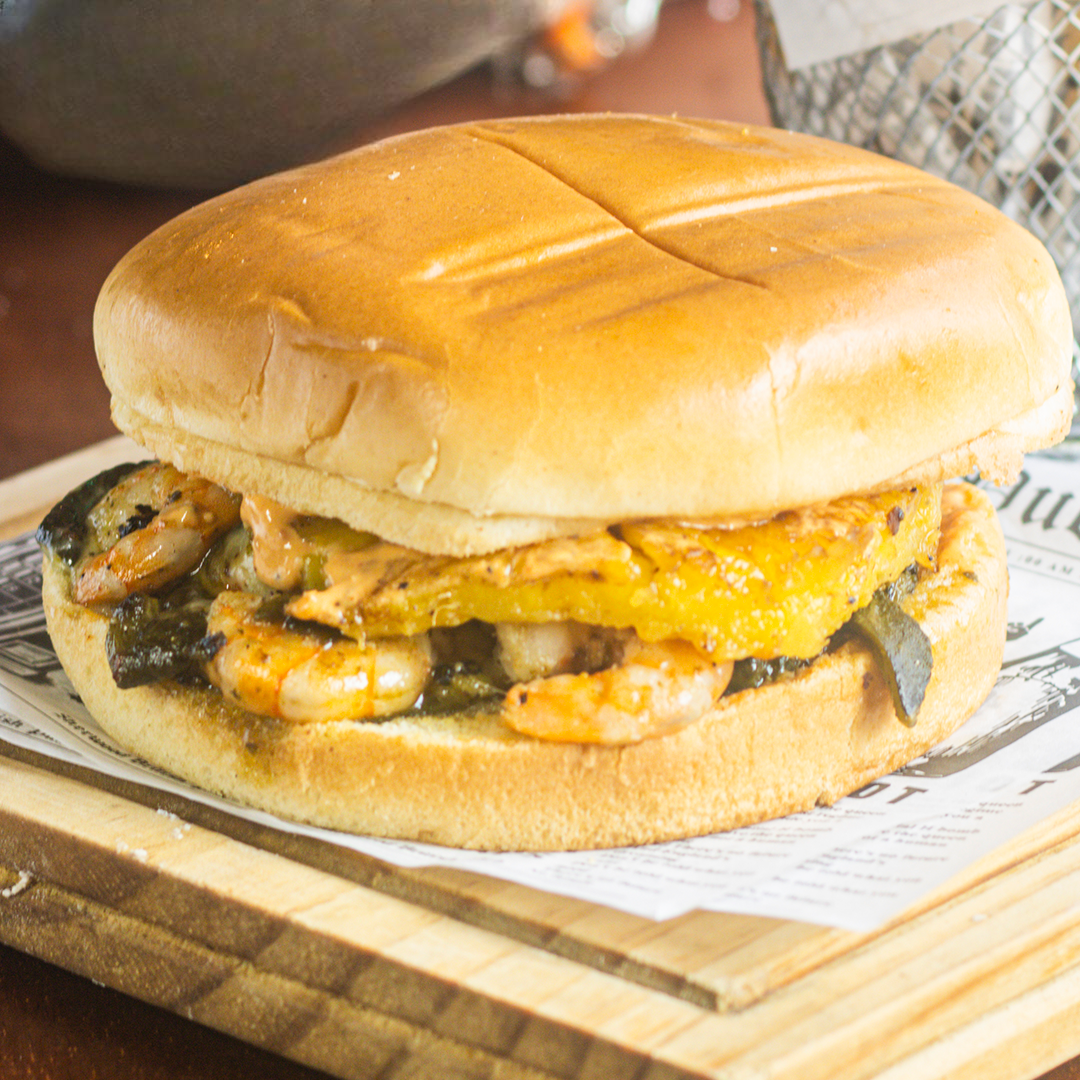 Pan brioche, camarones a la plancha con pimientos, chile poblano, queso manchego, piña caramelizada y aderezo de chipotle. Acompañado de 200 g. de papas a la francesa.