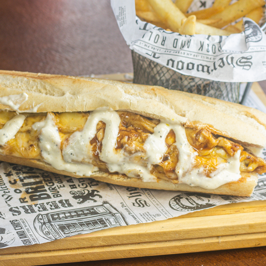 Pan baguette relleno de pechuga de pollo picada, cebolla blanca salteada y queso manchego gratinado, bañado en aderezo ranch y coronado con rodajas de jalapeño para un toque picante. Acompañado de papas a la francesa.