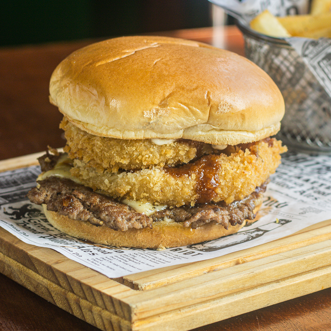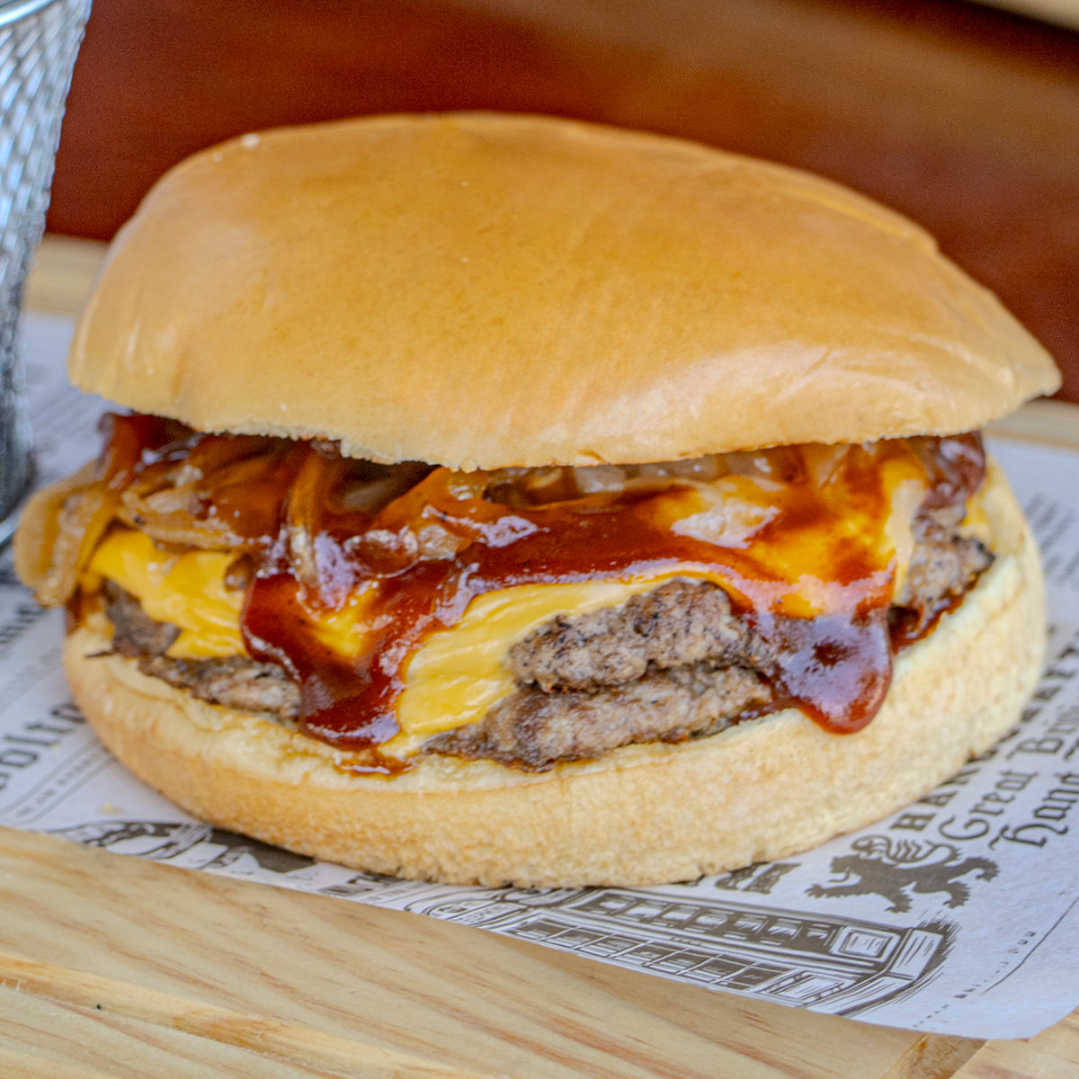 Pan brioche, carne de res smash, cebolla crispy, aderezo ranch, queso blanco, mermelada de tocino y salsa bbq ahumada. Acompañado de 200 g. de papas a la francesa.