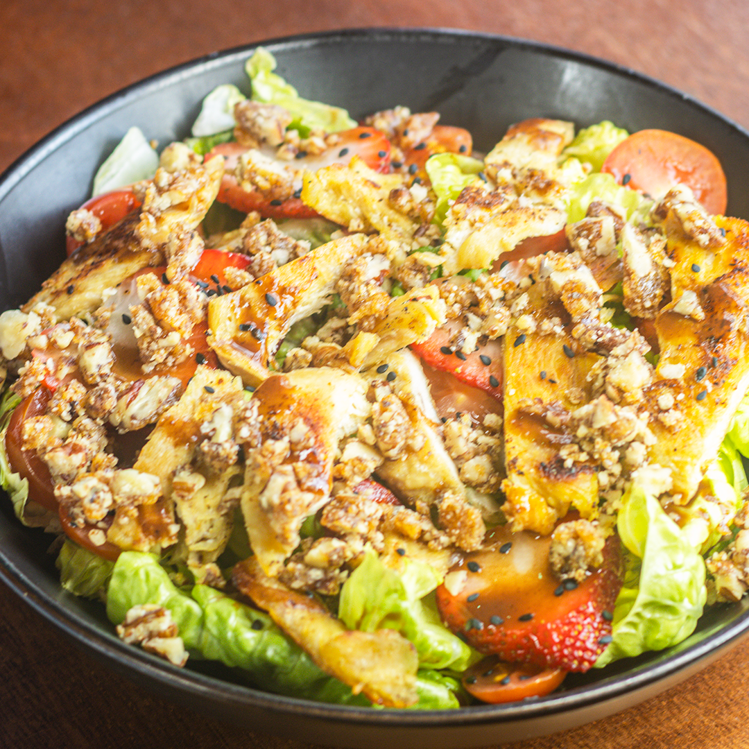 Lechuga baby sweet, fresas del campo, nuez caramelo, mango, tomate cherry, pechuga de pollo a la plancha, semilla de sésamo y salsa asían hot.