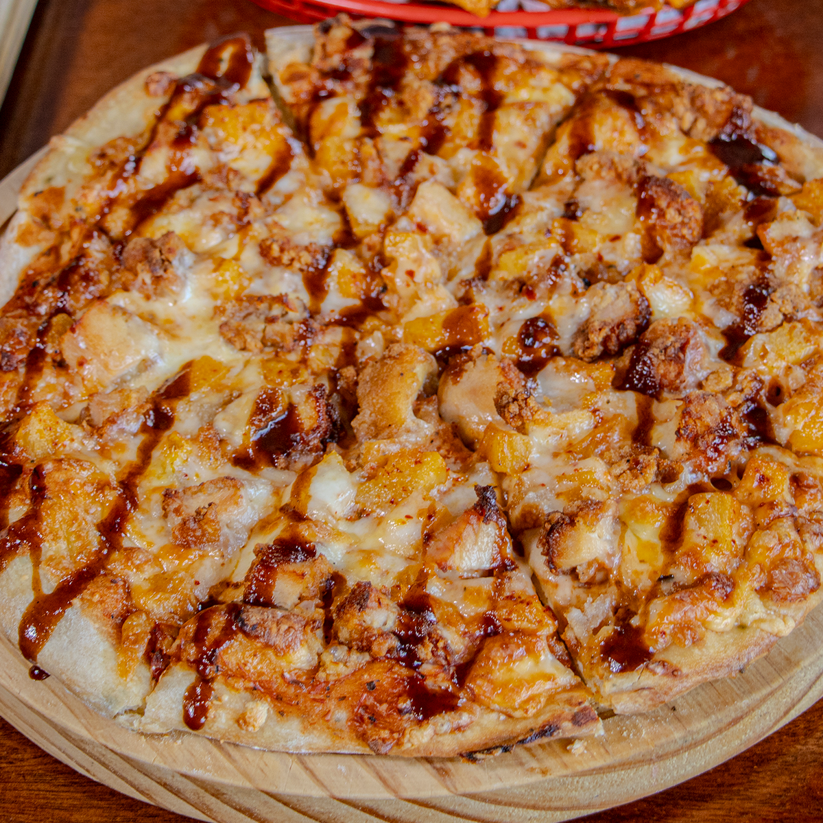 Base pomodoro, queso mozzarella, trozos de boneless, piña y salsa bbq hawaiana.
