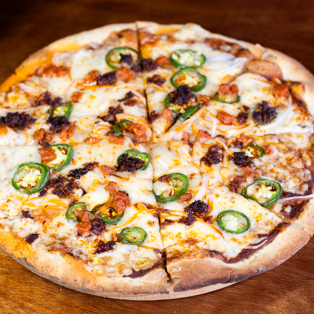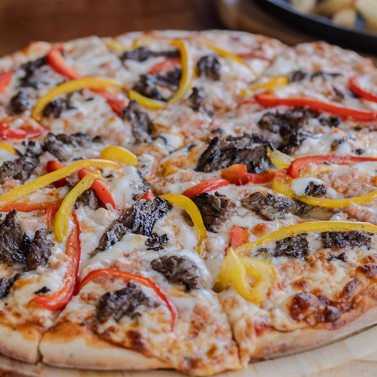 Salsa pomodoro, chorizo argentino, arrachera, pimientos, queso mozzarella y aderezo de chipotle.