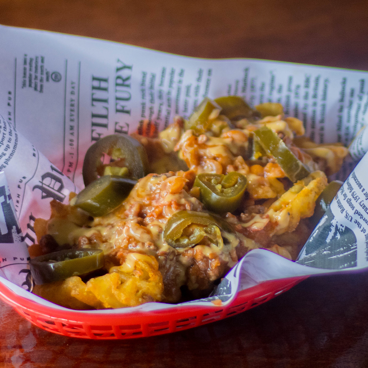 Papas crisscut sazonadas y cubiertas de chillibeans especial de la casa, rodajas de chile jalapeños y nuestro queso cheddar de casa.