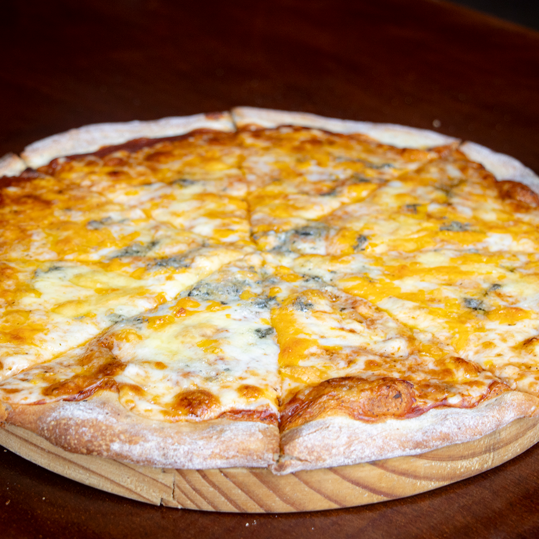 Base pomodoro, queso mozzarella, queso manchego, queso azul y queso cheddar