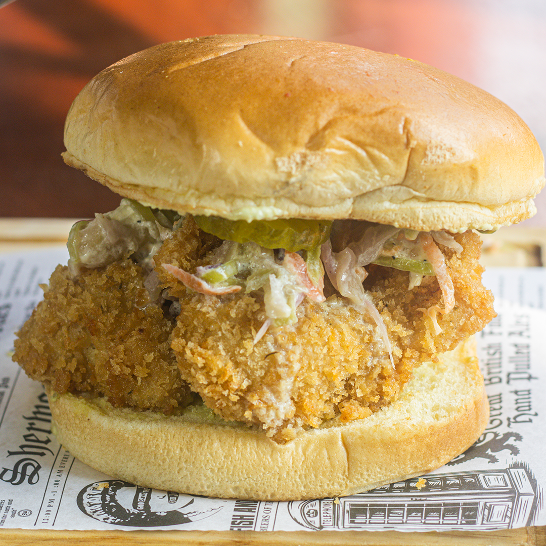 Pan brioche, pechuga de pollo crispy frita al momento, coleslaw, pepinillos y aderezo de jalapeño. Acompañado de 200 g. de papas a la francesa.