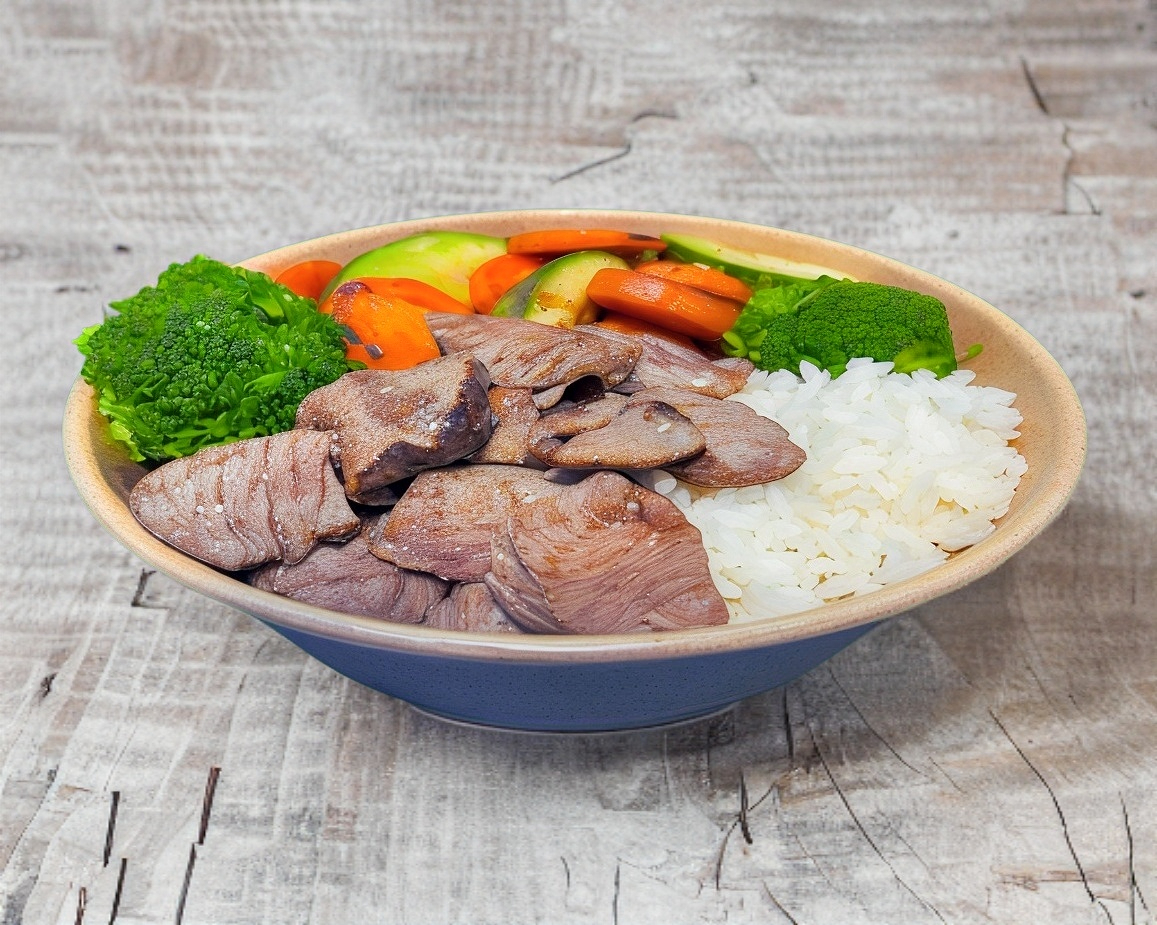 Base de arroz al vapor, pepinos, betabel, zanahoria rayada, aguacate y 150 grs de lomo de atún.