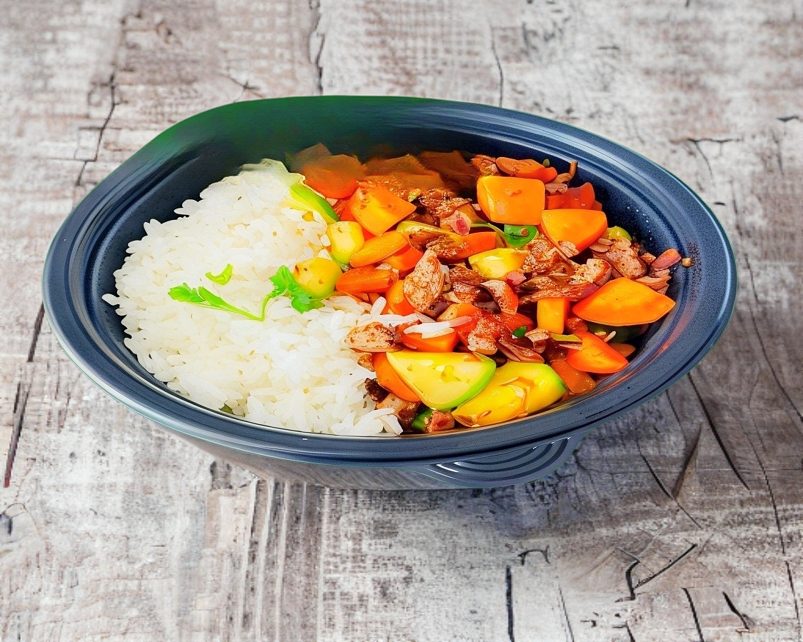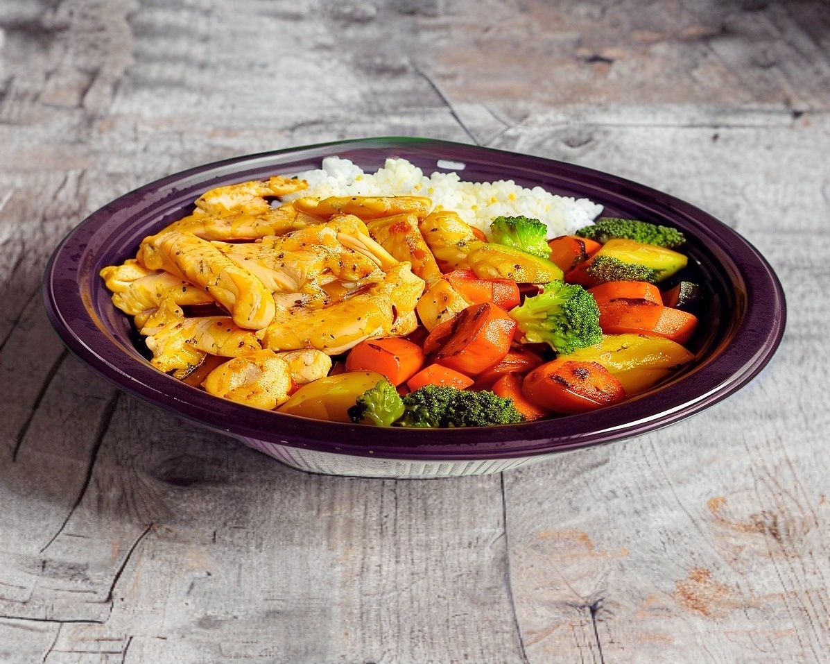 ZANAHORIA, CALABAZA, BROCOLI, ARROZ AL VAPOR, ADEREZO MAFER Y 150 GRS DE POLLO A LA PLANCHA PESADO EN CRUDO