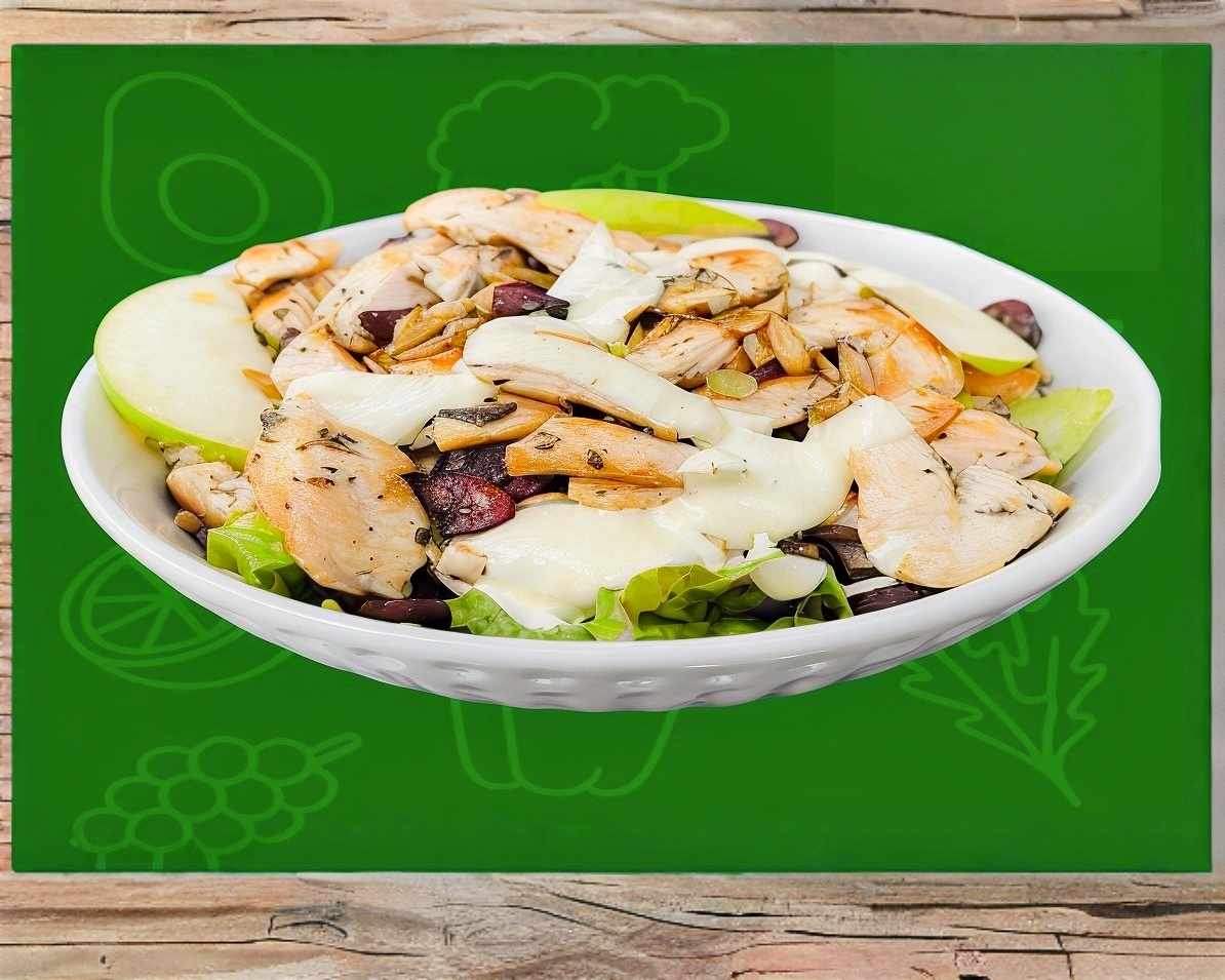LECHUGA, MANZANA, MIX DE SEMILLAS, QUESO PARMESANO, ADEREZO RANCH Y 150 GRS DE POLLO A LA PLANCHA PESADO EN CRUDO
