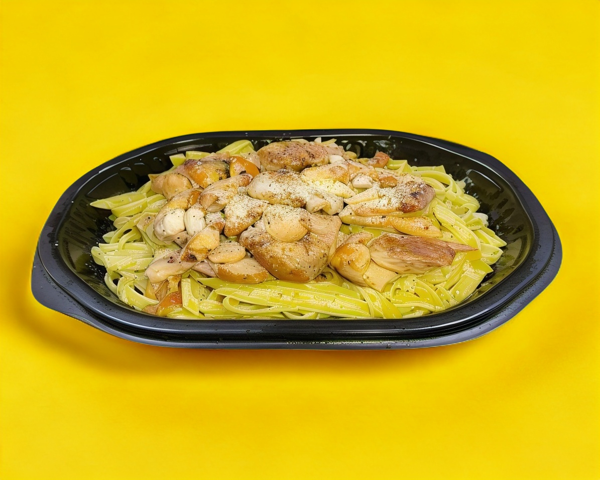 PASTA FETUCHINI, QUESO PARMESANO, SALSA VERDE Y 150 GRS DE POLLO A LA PLANCHA PESADO EN CRUDO