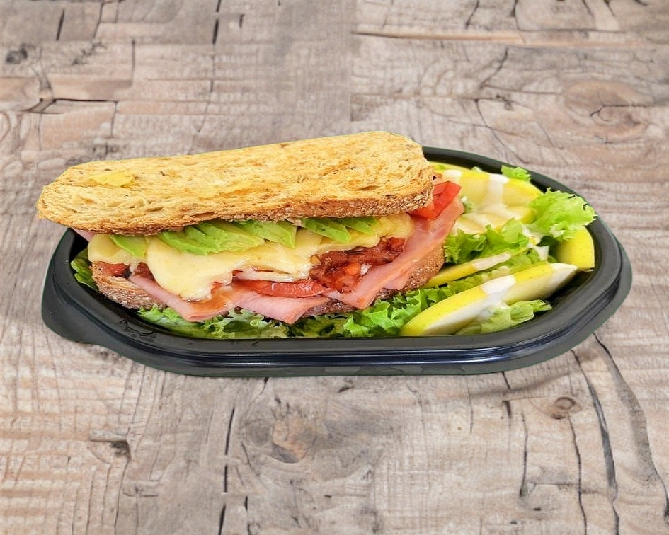 LECHUGA, MANZANA, PAN INTEGRAL, MAYONESA, QUESO MANCHEGO, TOMATE, AGUACATE, ADEREZO MAFER Y 120 GRS DE JAMON DE PAVO