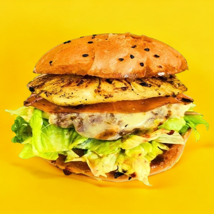 PAN DE AVENA, MAYONESA, LECHUGA, QUESO MANCHEGO, JAMON DE PAVO, PIÑA ASADA, ADEREZO MAFER Y 150 GRS DE CARNE DE RES ASADA PESADA EN CRUDO