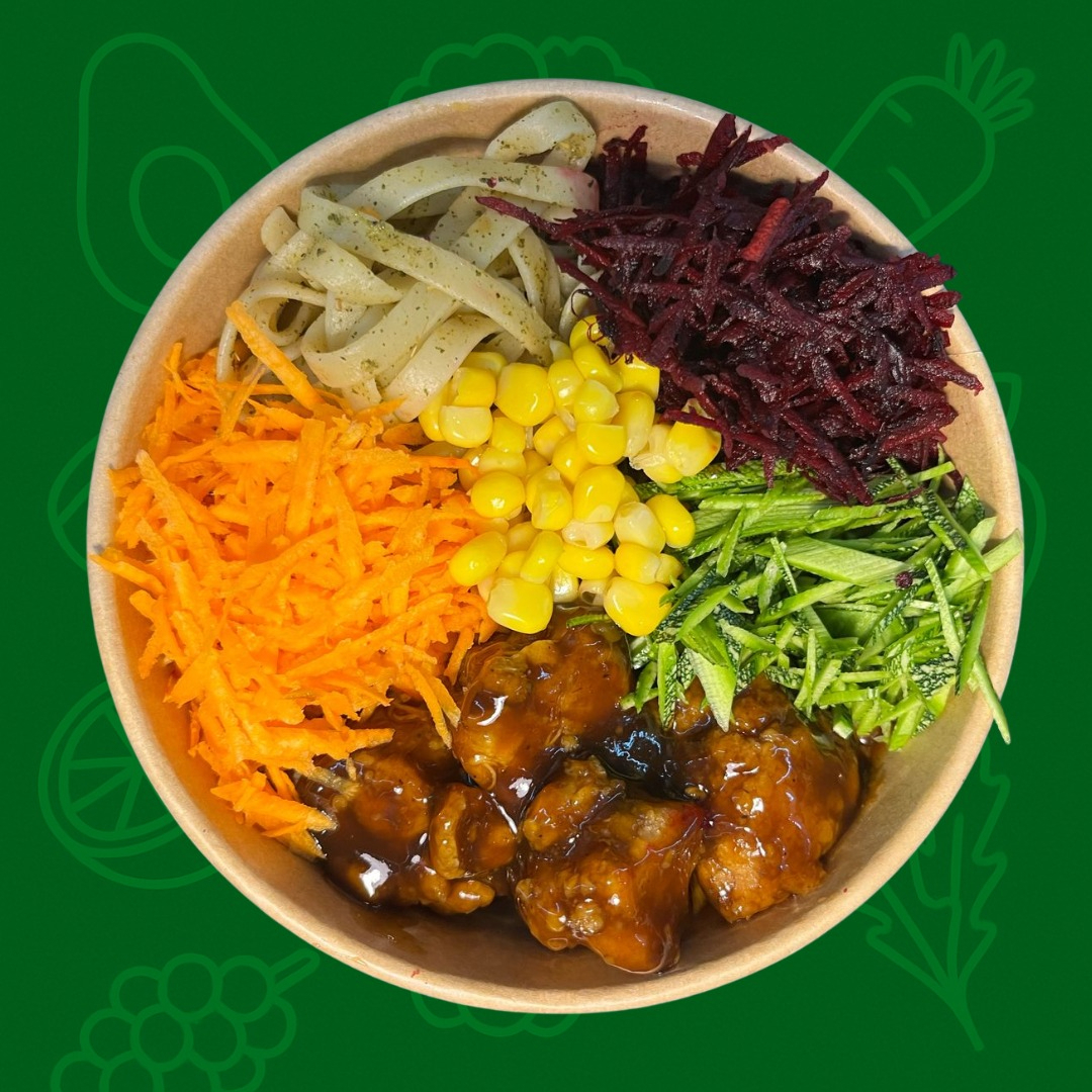 Base de arroz al vapor, Betabel, zanahoria rayada, calabaza rayada, elotes y 150 grs de pechuga de pollo(pesado en crudo) con salsa de mango habanero.