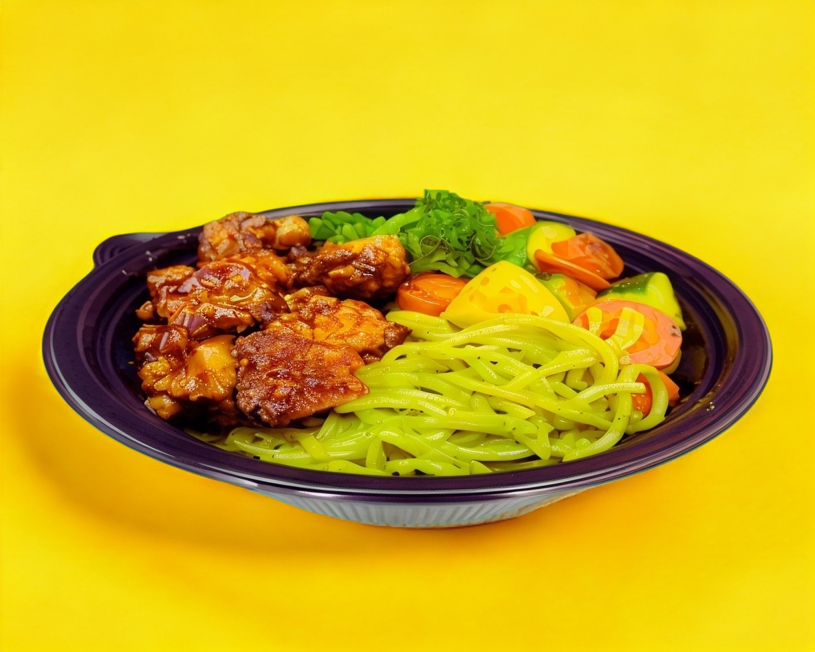 ZANAHORIA, CALABAZA, BROCOLI, ESPAGUETI, ADEREZO VERDE, SALSA BBQ Y 150 GRS DE BONELESS FRITOS PESADO EN CRUDO