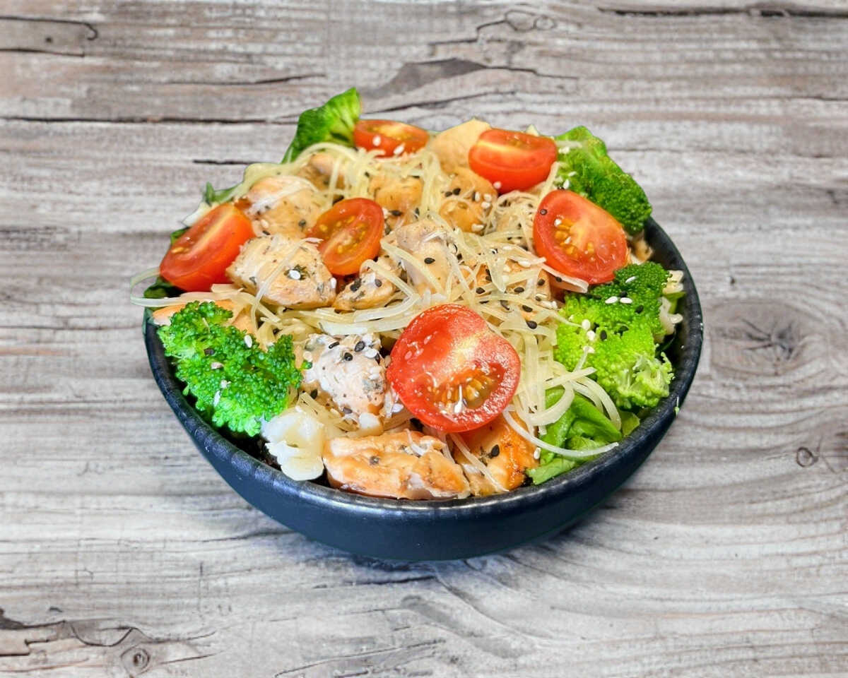 LECHUGA, BROCOLI, PASTA, AJONJOLI, QUESO PARMESANO, TOMATE CHERRY, ADEREZO RANCH, PAN INTEGRAL Y 150 GRS DE POLLO A LA PLANCHA PESADO EN CRUDO