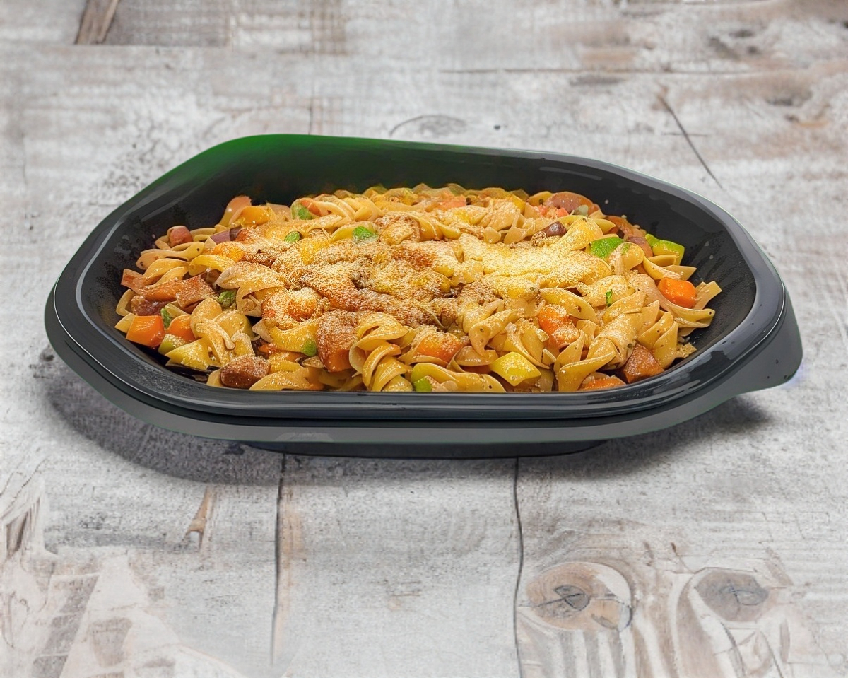 ZANAHORIA, CALABAZA, BROCOLI, PIMIENTOS, CHAMPIÑONES, PASTA, 150 GRS DE SIRLOIN PESADO EN CRUDO