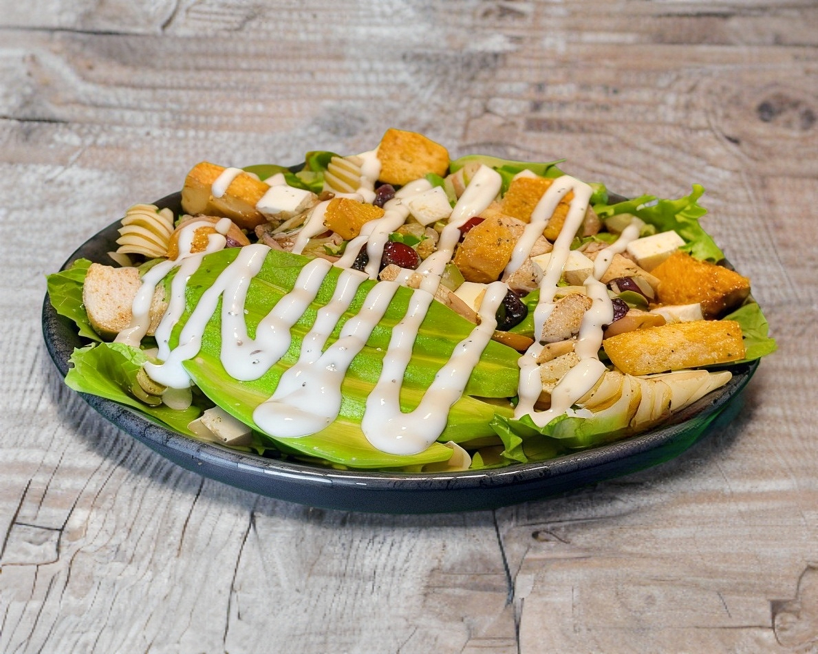LECHUGA, AGUACATE, MIX DE SEMILLAS, QUESO PANELA, PASTA, ADEREZO RANCH, CROTONES Y 150 GRS DE POLLO A LA PLANCHA PESADO EN CRUDO