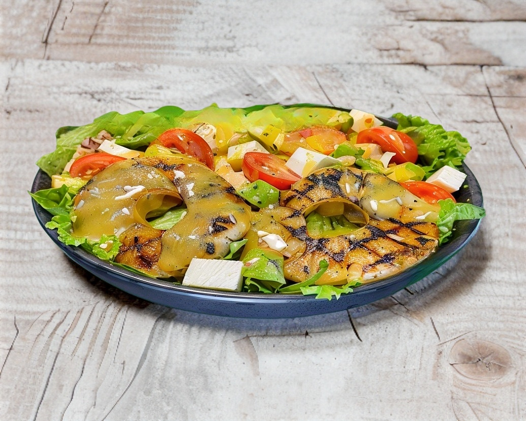 LECHUGA, AGUACATE, TOMATE CHERRY, QUESO PANELA, PIÑA ASADA, ADEREZO MOSTAZA MIEL Y 150 GRS DE POLLO A LA PLANCHA PESADO EN CRUDO