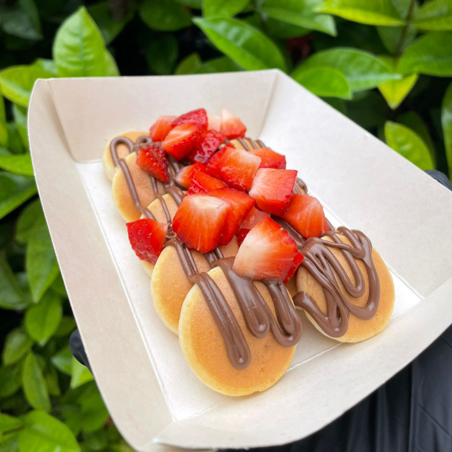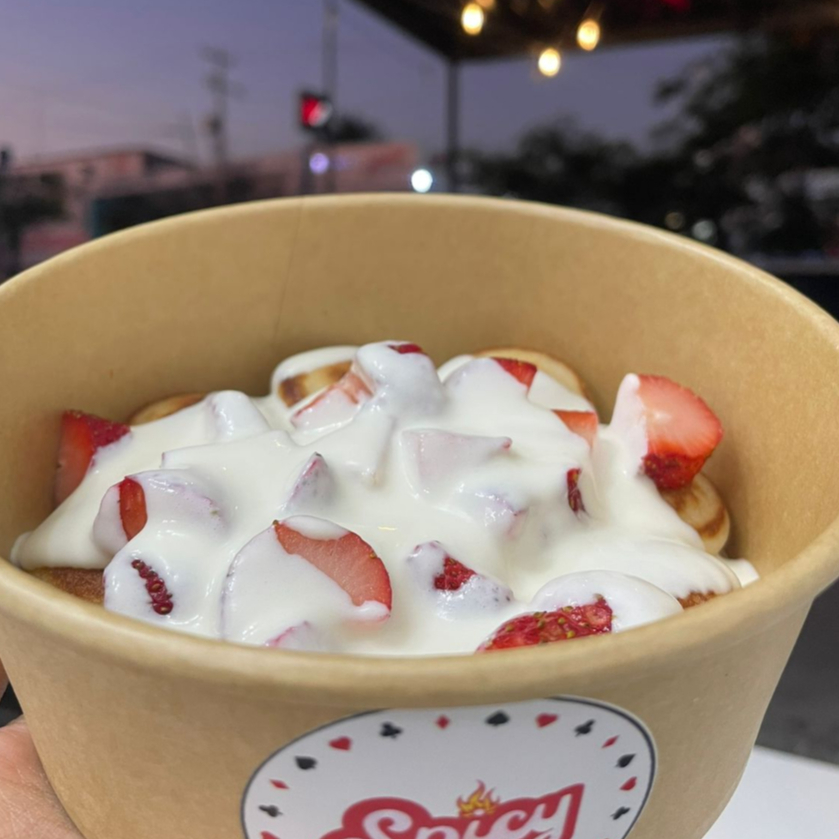 12 piezas de mini hotcakes, con topping de fresas naturales y bañado en nuestra crema preparada.