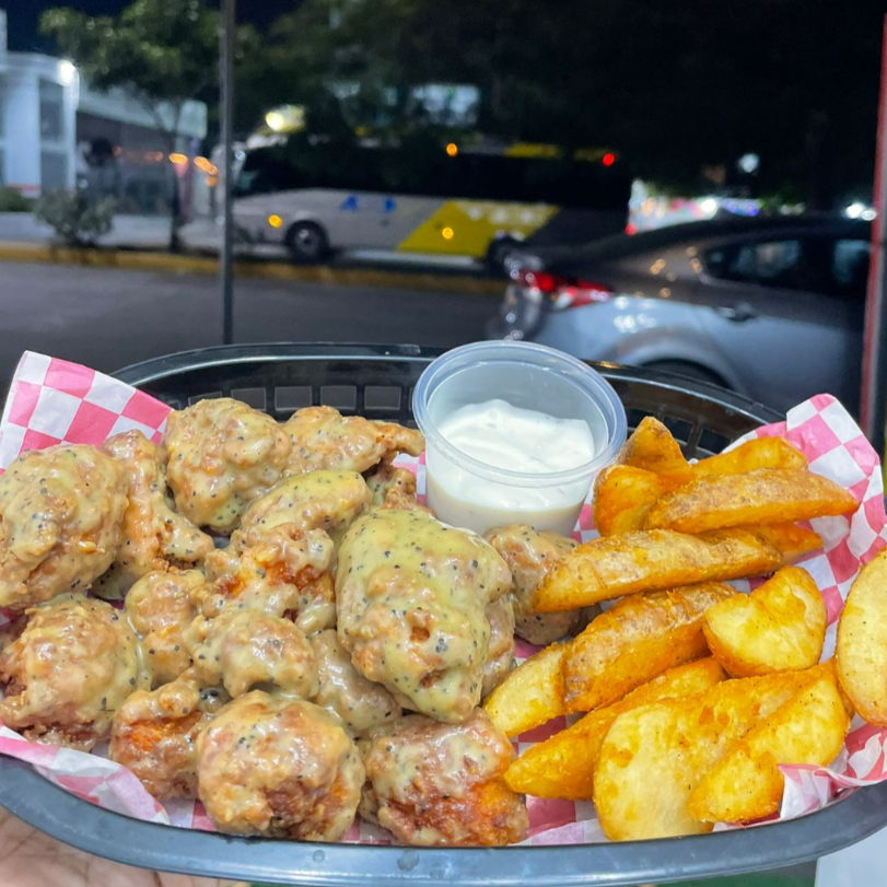 Orden de 300g de boneless bañados en salsa de tu elección, acompañados con 100g de papas fritas y aderezo ranch.