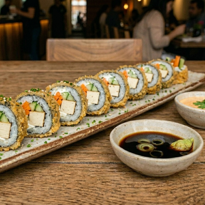 Rollo empanizado, con pepino zanahoria, queso philadelphia y tofu., incluye salsa soya y aderezo chipotle.
