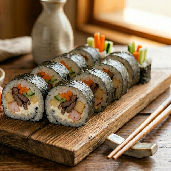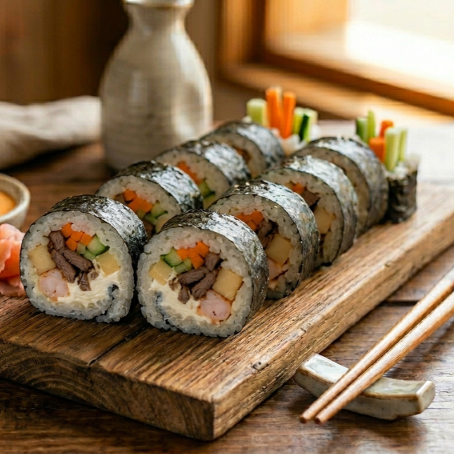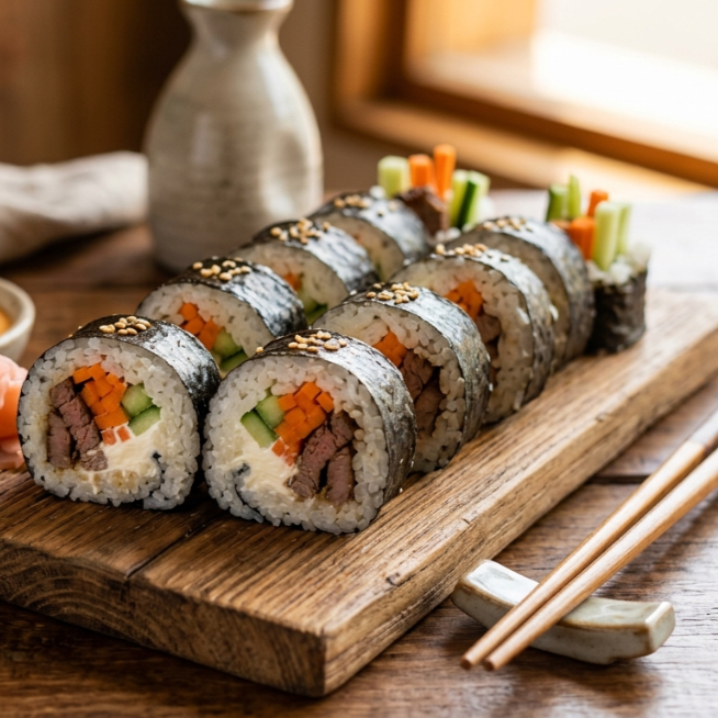Rollo natural, con queso philadelphia, zanahoria, pepino, arrachera; incluye salsa soya y aderezo chipotle.