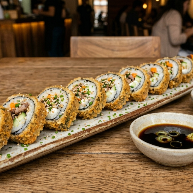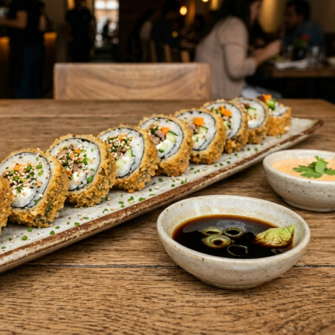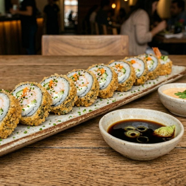 Rollo empanizado con queso philadelphia, queso manchego, camarón, arrachera, pepino y zanahoria; incluye salsa soya y aderezo chipotle