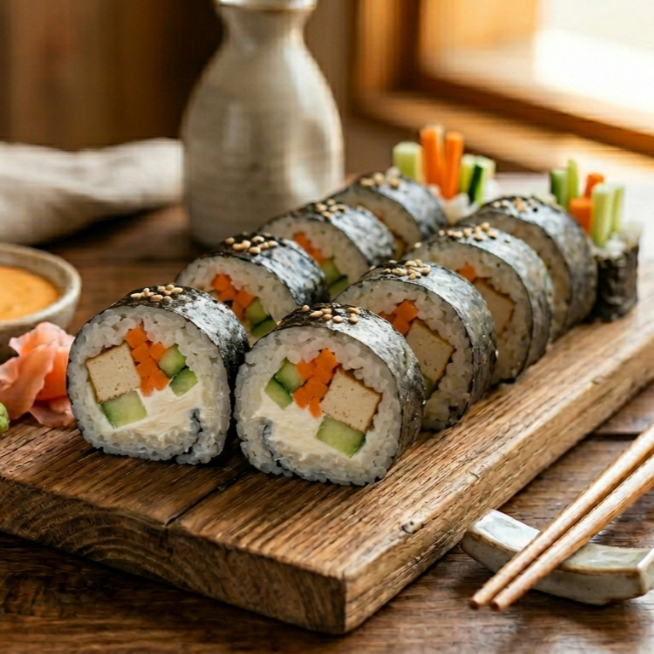 Rollo natural, con queso philadelphia, zanahoria, pepino, tofu; incluye salsa soya y aderezo chipotle.