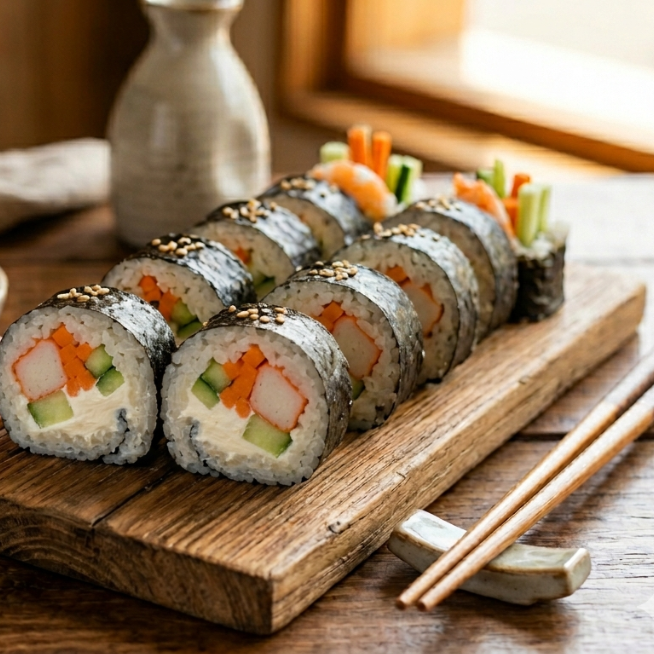 Rollo natural, con queso philadelphia, zanahoria, pepino, surimi; incluye salsa soya y aderezo chipotle.
