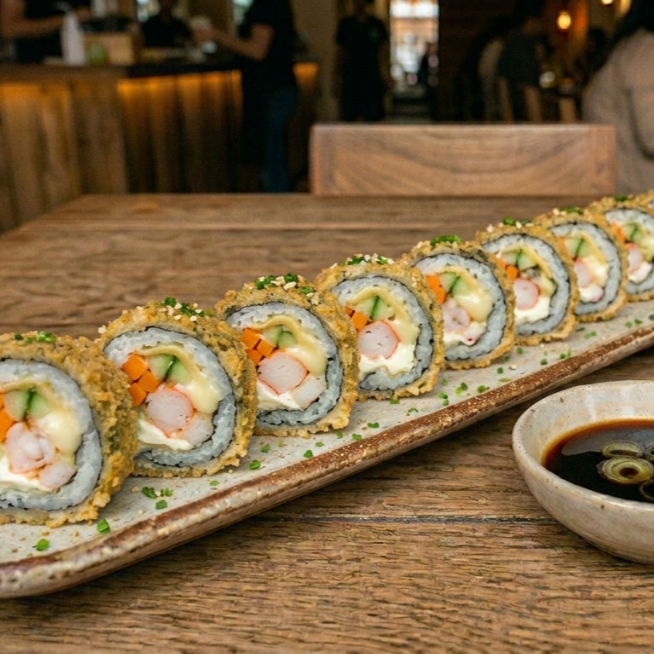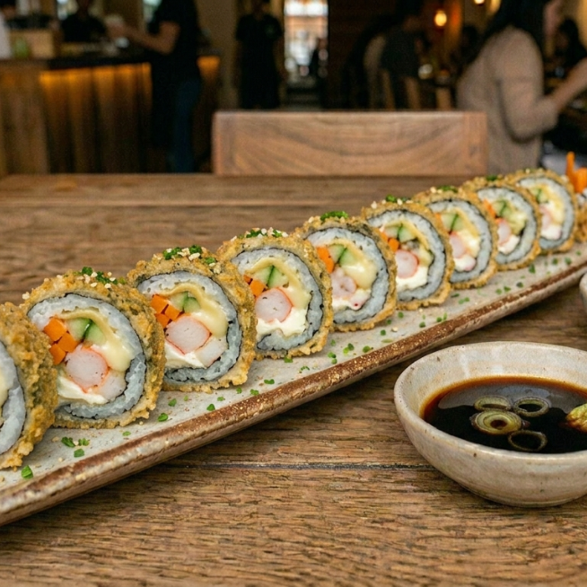 Rollo empanizado, con pepino zanahoria, queso philadelphia y surimi., incluye salsa soya y aderezo chipotle.