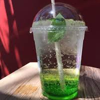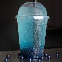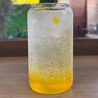 16 onzas, de soda a base de mineral, saborizante, perlas de sabor y fruta de la casa.